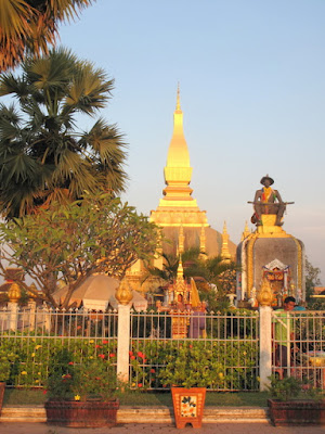 That Luang là biểu tượng của đất nước Lào. Là một tòa lâu đài tráng lệ, đồ sộ nằm ở trung tâm kinh thành với tháp nhọn vàng rực rỡ kiêu hãnh vươn lên giữa bầu trời xanh yên ả của Vientian. Chúng tôi đến đây vừa đúng lúc ánh hoàng hôn chiếu vàng rực lên ngọn tháp.